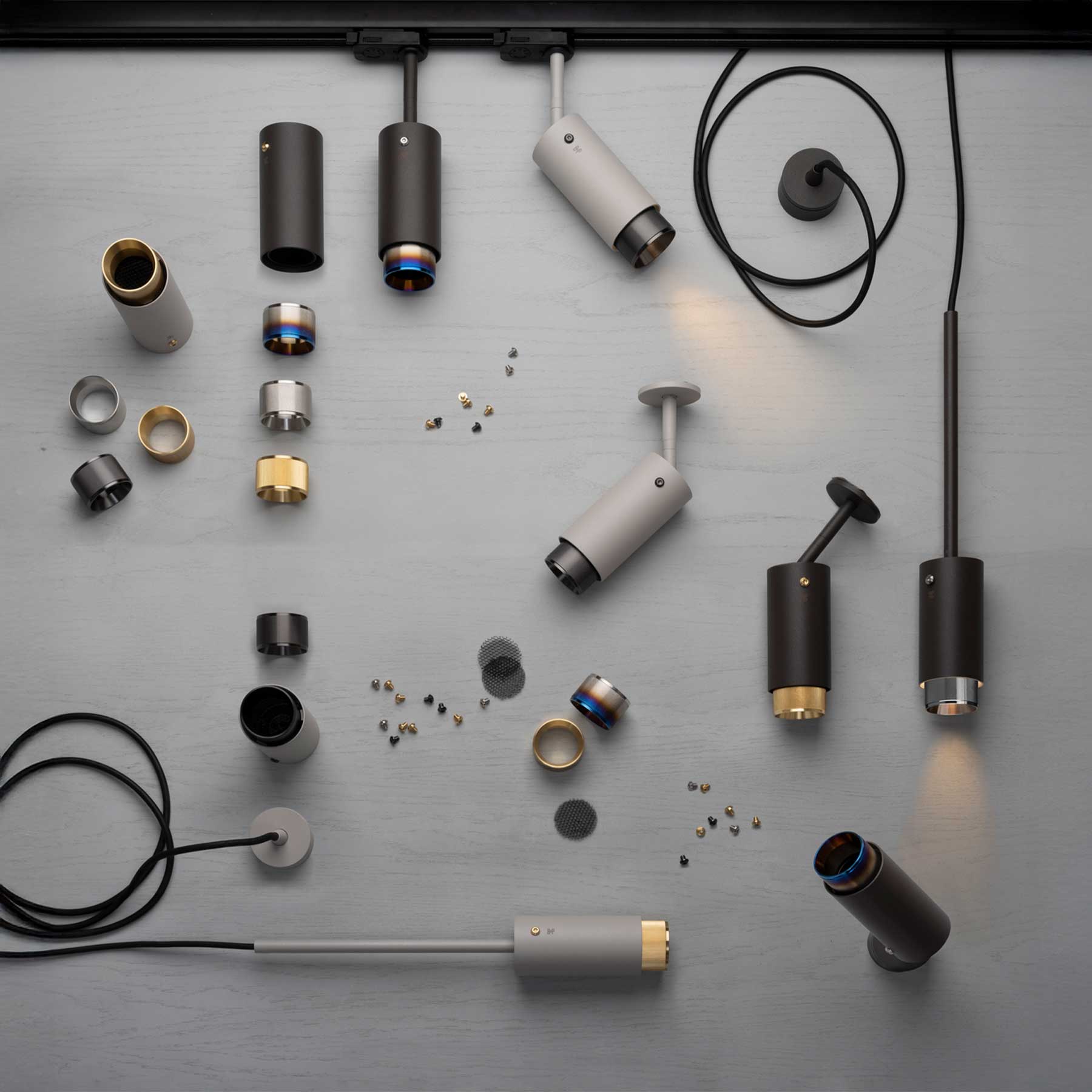 The Exhaust Cross reflector on the rail system is made of metal with a graphite or stone finish and complemented by stainless steel details in four finishes, including a cross-hatched screen and turned coin-style screws that have a glossy lacquered finish. The aperture catches the light and creates a subtle metallic sheen, while the honeycomb filter provides precise, glare-free, directional illumination. The reflector is fully adjustable, comes with a universal adapter for 3-circle rail systems in black and is compatible with GU10 bulbs.