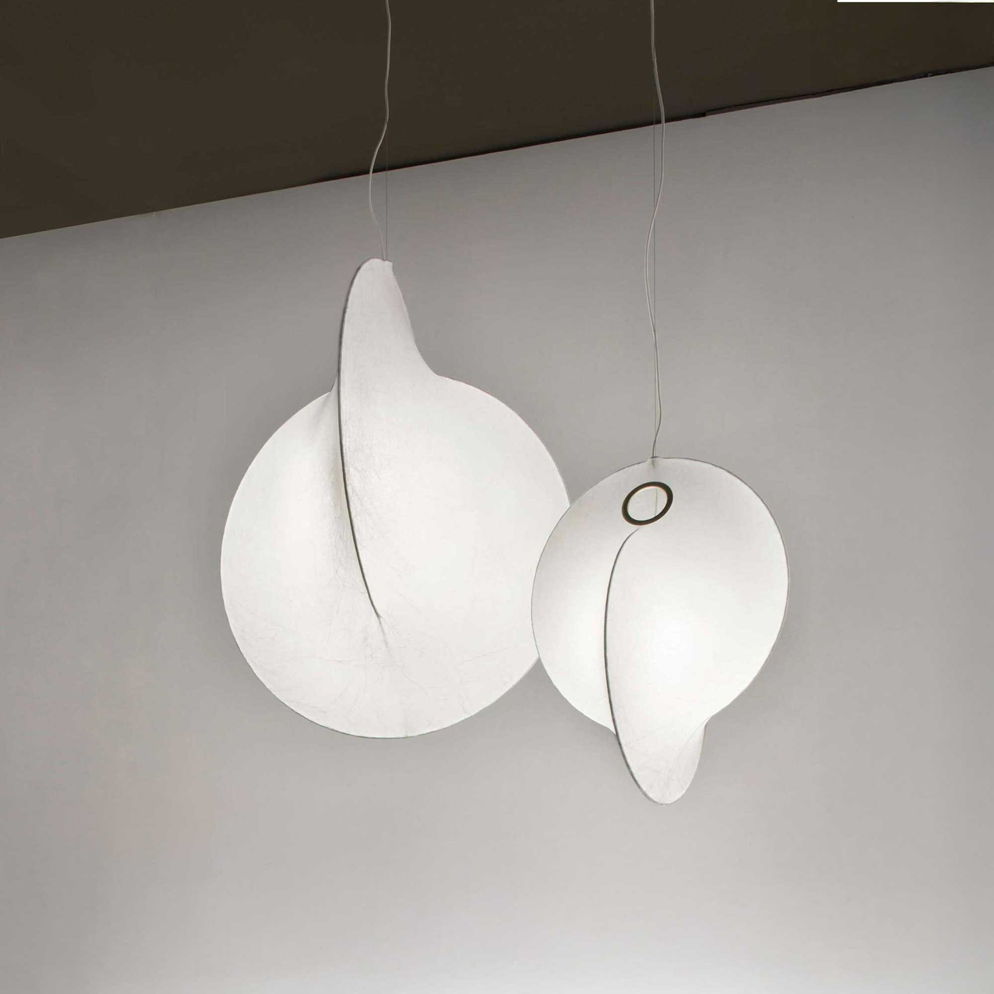 The Overlap pendant light by the Italian brand Flos, designed by Michael Anastassiades, is a unique example of the combination of innovative technology and subtle aesthetics. The inner structure of lighting is made of steel with a white powder-coated finish and is coated with a special Cocoon resin layer that creates a soft, diffused light. The surface is then protected with a transparent spray. A distinctive design element is also the metal ring in a gold electroplated finish, which visually breaks up the volume of lighting. The ceiling rosette is made of polished Zamak alloy, also with a gold electroplated finish. The luminaire is available in two sizes and resembles a cocoon whose delicate structure evokes an atmosphere of peace and harmony.