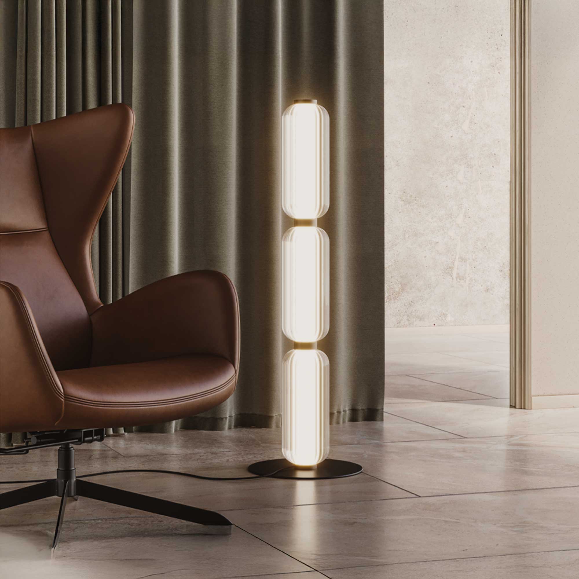 Stojací svítidlo Elma od španělské značky Aromas del Campo je dokonalým spojením moderního designu a luxusních materiálů. Na elegantní kovové základně v provedení zlatá nebo černá jsou umístěny tři skleněné válce, které vytvářejí působivé světelné efekty a jsou odděleny jemnými kovovými prstenci. Svítidlo je vybaveno integrovaným LED zdrojem 20 W s příjemnou teplotou světla 2700K, která navodí útulnou atmosféru. Díky stmívatelné funkci TRIAC si snadno nastavíte intenzitu světla přesně podle vaší nálady či potřeby. Design svítidla nese podpis renomovaného návrháře Jose Fornase, který propojuje eleganci, minimalismus a precizní zpracování. Svítidlo Elma je ideální volbou pro ty, kteří chtějí dodat svému interiéru sofistikovaný a originální prvek osvětlení.