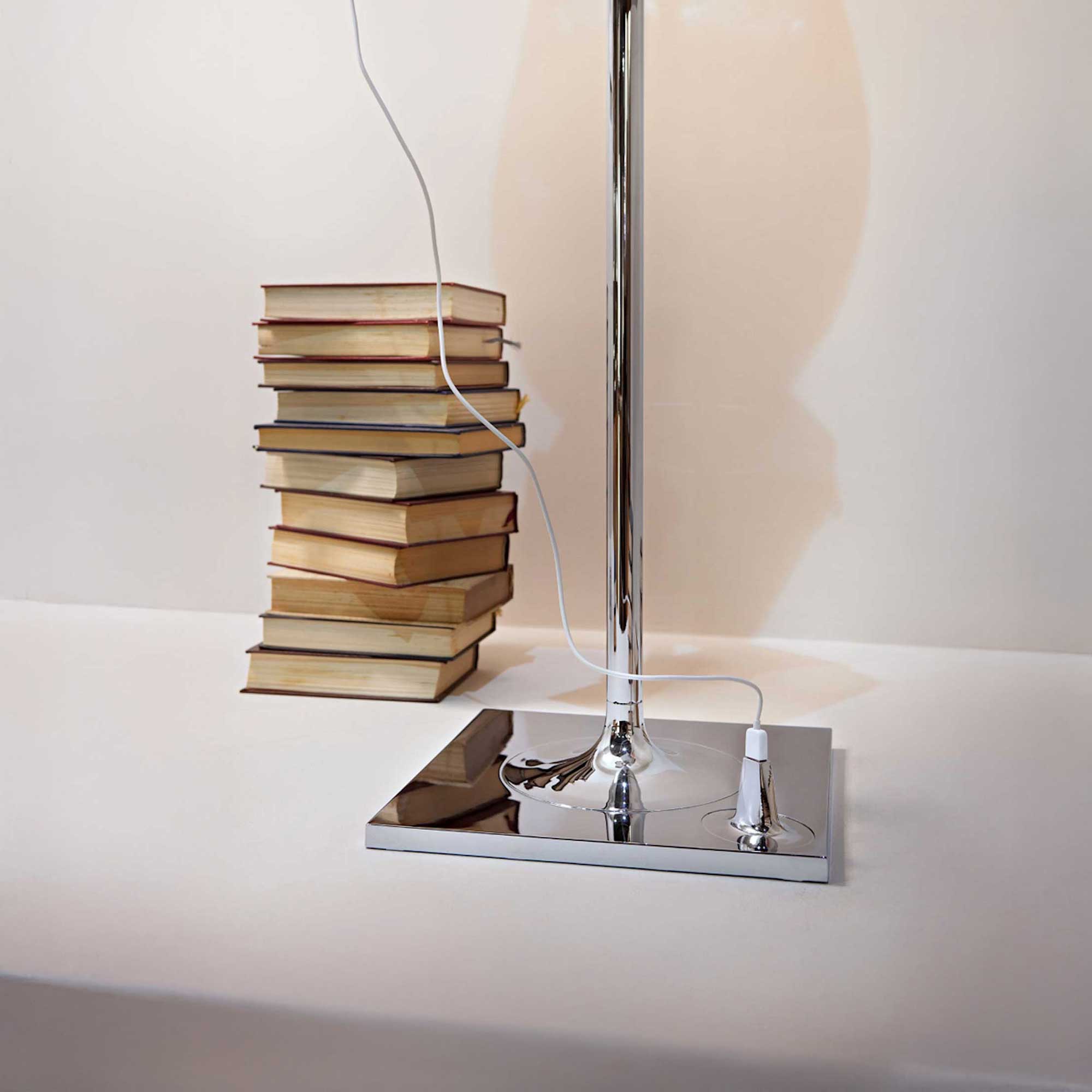 Stojací svítidlo Bibliotheque Nationale od italské značky Flos, navržené Philippem Starckem v roce 2013, není jen zdrojem světla, ale i praktickým kusem nábytku. Kombinuje funkci knihovny díky lesklým nerezovým konzolám, které vystupují z centrální tyče a umožňují ukládat knihy či jiné předměty. Tělo svítidla tvoří chromovaná zinková základna, stojan a držák difuzoru, zatímco vnitřní difuzor je z opálového vstřikovaného polykarbonátu. Vnější stínidla jsou dostupná v několika variantách: PVC textilie, čirý nebo kouřově šedý metakrylát, případně se stříbrnou či bronzovou vnitřní vrstvou díky vakuovému hliníkovému pokovení. Vrchní prstenec je z čirého vstřikovaného polykarbonátu. Navíc je v základně integrován USB port (max. 2A), který umožňuje nabíjet běžné smartphony a tablety.