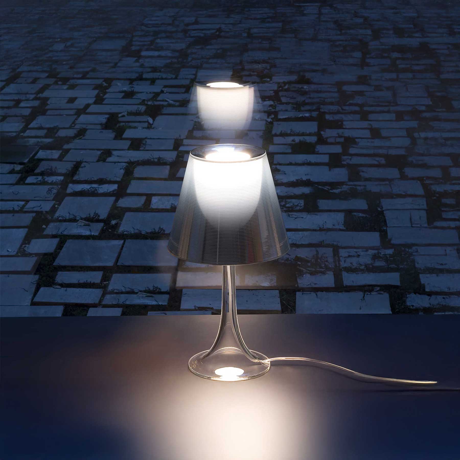 Stolní lampa Miss K od italské značky Flos, navržená Philippem Starckem, je ikonickým příkladem moderního designu kombinujícího technologickou preciznost s estetickou jemností. Poskytuje měkké, rozptýlené světlo díky vnitřnímu opalizovanému difuzoru z polykarbonátu a vnějšímu stínidlu z transparentního nebo probarveného polykarbonátu, které je upraveno technologií vysokovakuové aluminizace – při zhasnutí působí kovově a zrcadlově, po rozsvícení elegantně prosvítá. Rám lampy je plně transparentní a vyrobený z PMMA vstřikováním. Miss K je ideální pro ložnice, obývací pokoje i stylové pracovní prostory, kde vynikne jako funkční i dekorativní prvek.