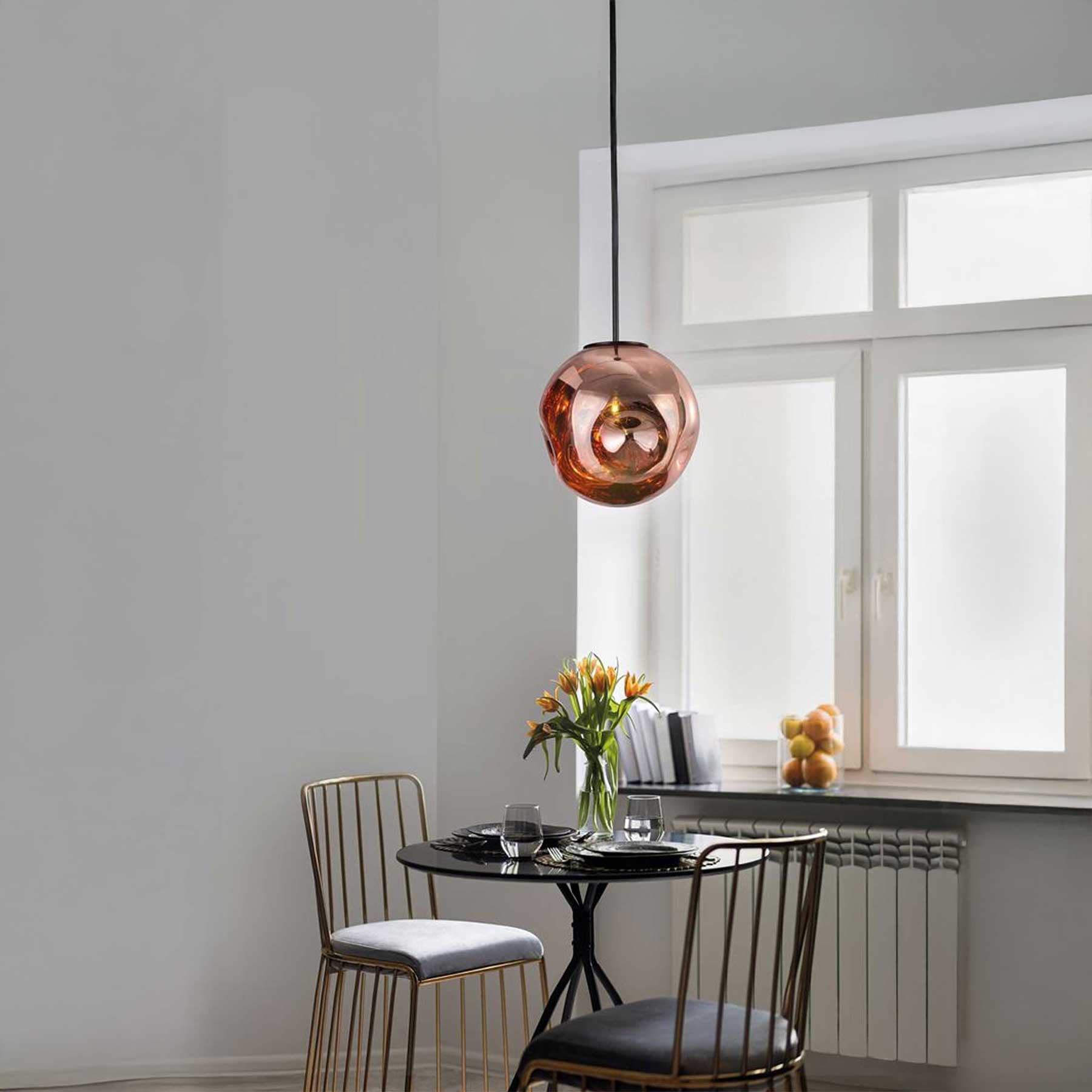 Závěsné svítidlo Mayan od renomované řecké značky Nova Luce představuje elegantní kombinaci moderního designu a jemného sklářského umění. Stínidlo je vyrobeno z foukaného skla, jehož organický kulový tvar s nepravidelnými vlnkami vytváří zajímavé optické efekty. Svítidlo využívá patici E27, což zajišťuje flexibilitu při výběru světelného zdroje. Mayan je dostupné ve třech stylových barevných provedeních: měděná, šampaňská a kouřová. Díky svému výraznému vzhledu se hodí jako solitérní prvek i jako součást více svítidlové instalace v moderních interiérech.